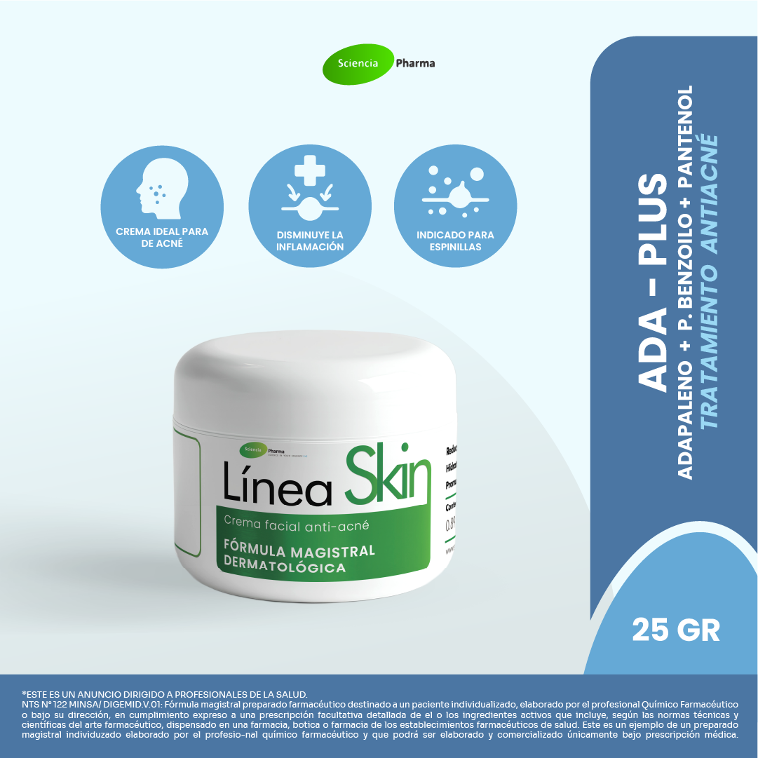 Ada – Plus es una crema antiacné formulada para combatir los brotes severos, como nódulos, espinillas inflamadas y granos profundos. Su combinación de Adapaleno al 0.30%, Peróxido de Benzoilo, Pantenol y Alantoína actúa reduciendo el enrojecimiento, desinflamando las lesiones y favoreciendo la regeneración cutánea. Ideal para pieles con acné resistente y persistente.