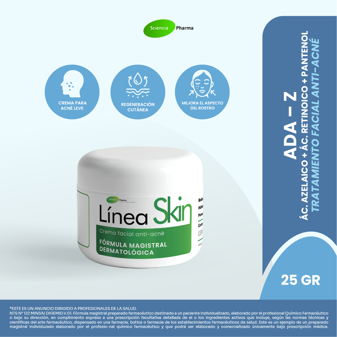 Ada – Z es una crema antiacné formulada especialmente para tratar el acné leve, ayudando a reducir espinillas, inflamación y enrojecimiento sin agredir la piel. Su combinación de Ácido Azelaico al 20%, Ácido Retinoico, Pantenol y Alantoína promueve la renovación celular y la descongestión de los poros, ofreciendo una piel más limpia, uniforme y libre de imperfecciones.