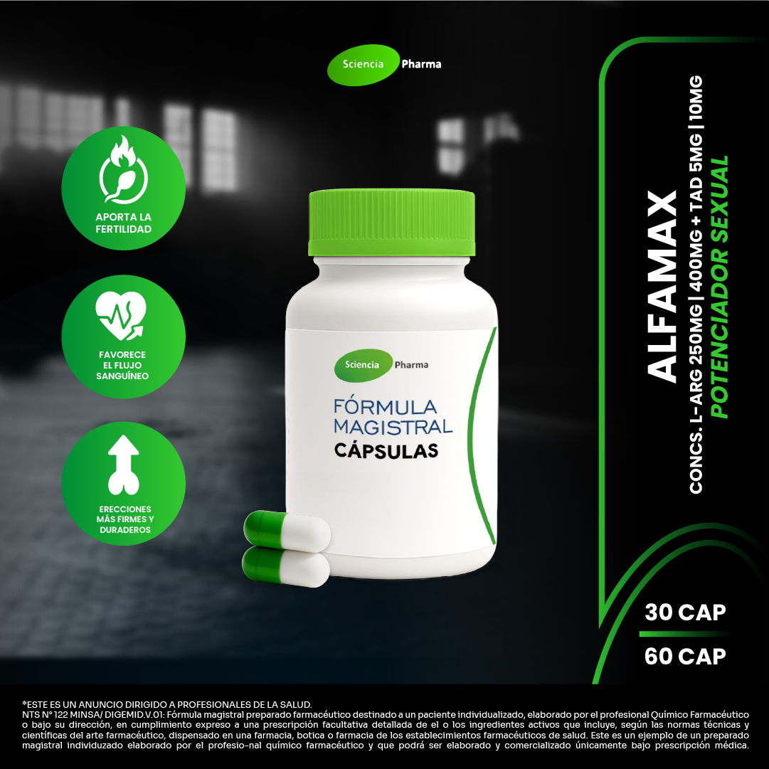 Alfamax es un suplemento masculino formulado con Tadalafilo y Arginina, ideal para potenciar el deseo sexual, mejorar el flujo sanguíneo y favorecer erecciones más firmes y duraderas. Además, actúa positivamente sobre el ánimo, ayudando a mejorar el rendimiento físico y mental antes de la actividad sexual.