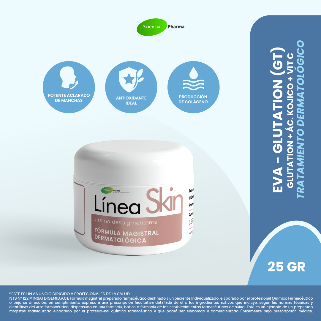 Eva Glutation es una crema despigmentante formulada con potentes activos antioxidantes que ayudan a unificar el tono de la piel y reducir visiblemente las manchas. Gracias a su contenido de Ácido Glutathiónico, Ácido Kójico, Vitamina C y Pantenol, esta fórmula combate la oxidación celular, estimula la producción de colágeno y mejora la luminosidad cutánea. Ideal para pieles con hiperpigmentación o exposición solar prolongada.