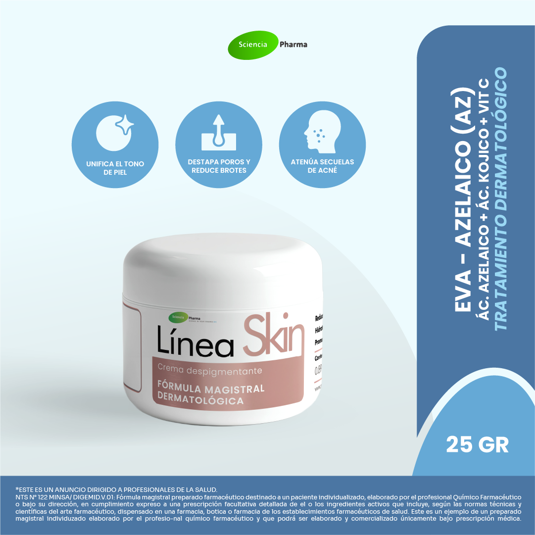 Eva – Azelaico es una crema facial despigmentante diseñada especialmente para pieles con acné activo o secuelas de brotes. Formulada con Ácido Azelaico al 15%, Ácido Kójico, Ácido Mandélico, Vitamina C y Pantenol, ayuda a reducir manchas post-acné, atenuar rojeces e imperfecciones y destapar poros obstruidos. Su uso regular mejora visiblemente la textura y el tono de la piel sin causar irritación.