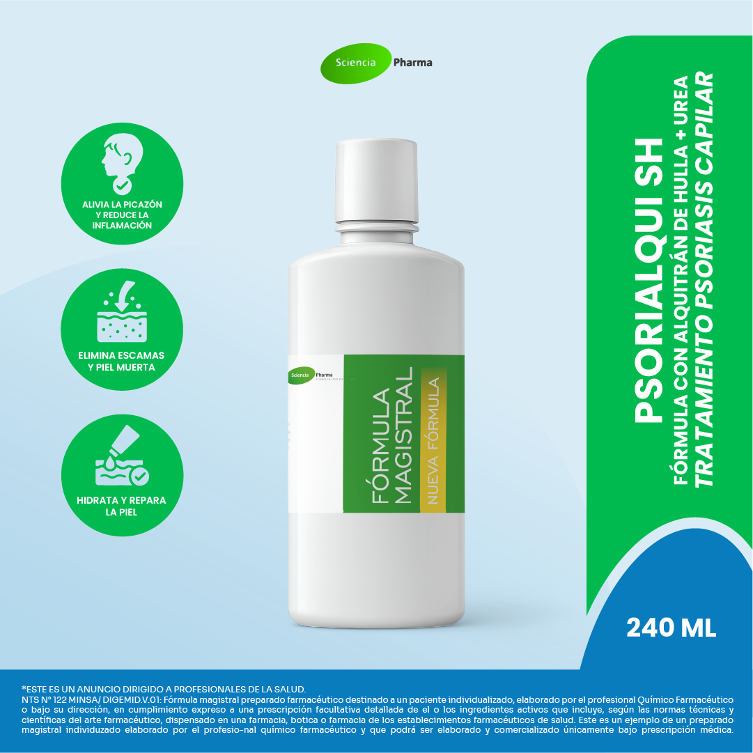 Psorialqui SH es un shampoo especializado para el tratamiento de la psoriasis en el cuero cabelludo. Su fórmula dermatológica con Alquitrán de Hulla al 5% y Urea al 4% está diseñada para reducir eficazmente la descamación, calmar la irritación y restaurar la barrera cutánea. Ideal para aliviar los síntomas psoriáticos y promover un cuero cabelludo más sano e hidratado.